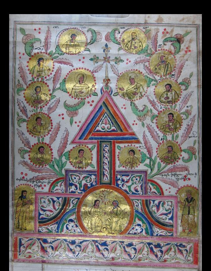 By its structure and inspiration, the document clearly illustrates different aspects of Iranian-Georgian political, social and juridical aspects. As for illumination, it could be considered of a mixed type, Persian and Georgian: borders and ornaments reflect Oriental influence, while figures are essentially Christians (Apostles, secular and religious authorities), their expression manner also remains essentially Georgian.