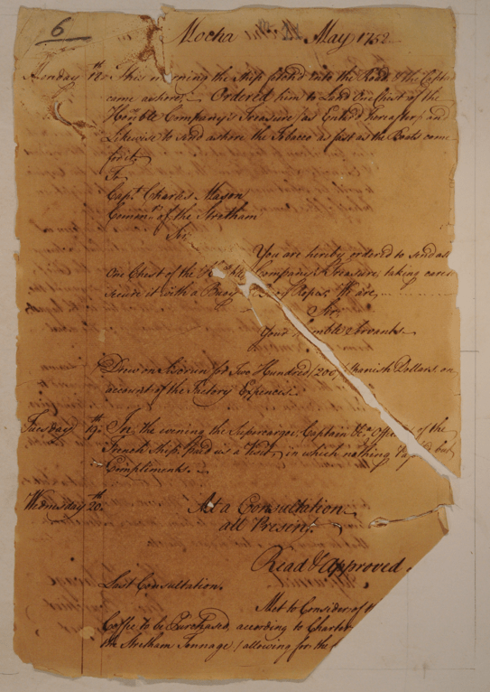 The course is entitled Sweet Addictions: Coffee, Tea, and Sugar in Global Empires and takes a commodities approach to introducing students to key themes in global history post-1500. As we make it to the midterm in the course, I wanted students to have something grounded in a moment in time and an assignment that exposes them to how historians do their work. For this assignment, which takes place over two weeks, I present students with three handwritten archival pages from the East India Company’s Mocha Factory Diaries which detail the issues faced by one coffee trading ship, the Stretham, in 1752 in the Yemeni port of Mocha. This document set is sourced from the Maharashtra State Archives in Mumbai, which I had originally looked through during my dissertation research as I was searching for mentions of the Mughal trading fleet that carried pilgrims to Mecca. I have since utilized these documents in upper division courses for understanding the dynamics of the early modern Red Sea, as most students do not have the language skills to look at original archival material not in English.