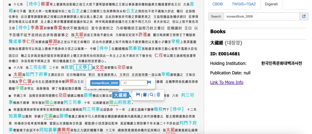 In 2019, the team behind MARKUS launched K-MARKUS for the markup of Korean texts written in classical Chinese. It automates the tagging and identification of Korean personal names, place names, official bureaucratic titles and posts, and book titles by default. This automation streamlines the annotation process, significantly reducing the time and effort required of a scholar to run textual analysis to scale. By integrating data sets from important Korean institutions such as the Academy of Korean Studies, the Institute for the Translation of Korean Classics, and the Institute of Traditional Culture, MARKUS annotates texts quickly while also ensuring data accuracy. For Korean book titles, users can click on the mark-up differentiated book title and the metadata for that text will appear on the side menu with a link to the text’s entry in the Encyclopedia of Korean Culture. In the example below, the Korean Tripitaka has been identified and links to this page on the Encyclopedia. Of course, with any automated procedure, anachronisms will appear it is up to the user to clean up the markups of their document, which is easy to do in MARKUS.