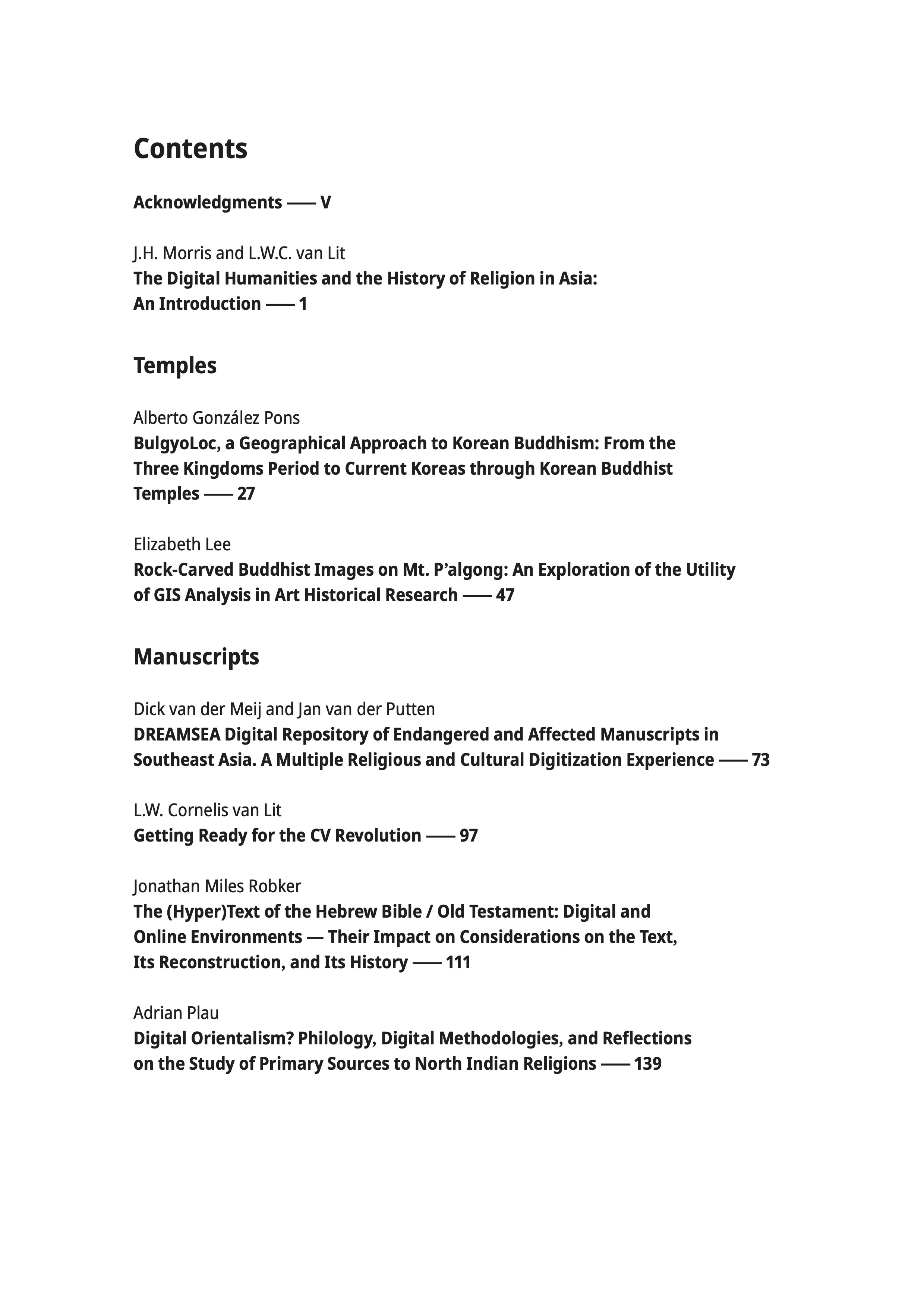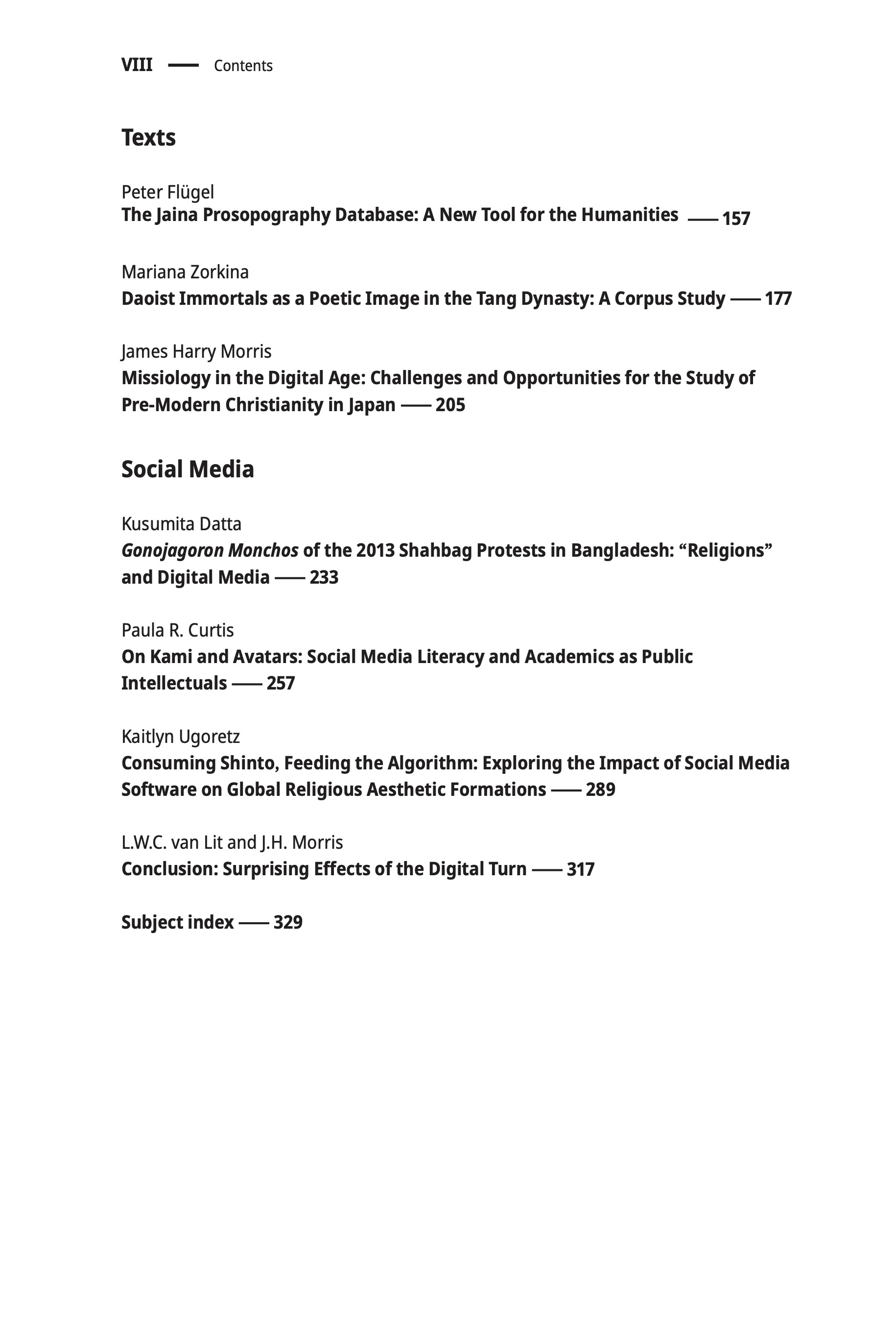 The book is ordered from most physical to most digital: we start with the study of structures such as temples and statues, then move on to materials containing text such as manuscripts and archives, after which we arrive at the texts themselves contained in databases and editions, to end with born-digital materials such as social media interaction and digital religious practices.