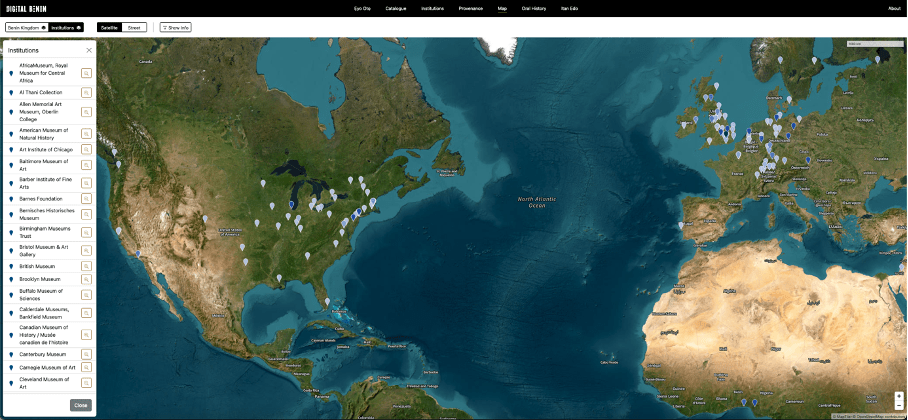 Although the project has been in the pipeline since 2010, the international team of the Digital Benin project, led by Felicity Bodenstein (Univ. Paris-4), Anna Luther (Institut for Digital Heritage) and Prof. Dr. Barbara Plankensteiner, director of the MARKK, has been very active since 2019 in order to bring together around 5000 objects belonging to this heritage, spread across 131 institutions and collections worldwide (mainly in the US, UK and Germany, see map below) into a single digital space .