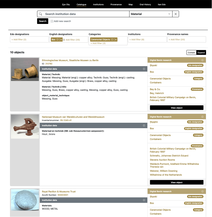 The catalogue is the central tool of Digital Benin, one of the two digital spaces on the platform where the scattered Benin objects have been reassembled. It is possible to search, filter, study, and view the data of 5246 historical objects from the Benin Kingdom from 131 institutions in twenty countries.