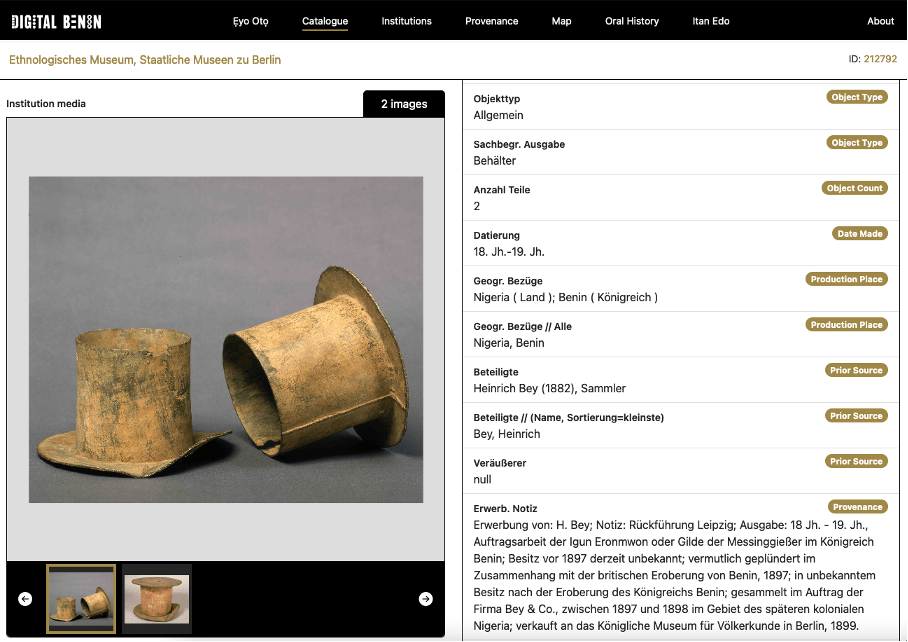 131 institutions were asked to send the descriptions of their objects, together with images of each artefact and any available information documenting the history of their acquisition. In order to facilitate this process, those responsible for submitting the descriptions were not asked to restructure their metadata according to a uniform grid that Digital Benin would have superimposed on their existing metadata. On the contrary, Digital Benin undertook to publish each institution’s metadata as it was, both in its public form (what was already publicly available through the API) and in its internal form, sent directly by the institutions, if the two differed, see for example here.