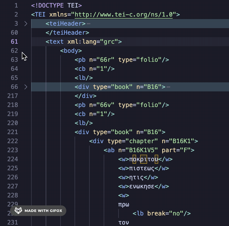 My last post interacts with two major languages. The first and easiest one to interact with is XML (Extensible Markup Language). By easy, I mean you will not be writing any XML. That is what the transcription editor is for! The flavor of XML that I will be analyzing complies with the Text Encoding Initiative (TEI) and the guidelines set forth by the International Greek New Testament Project (IGNTP). Your flavor of TEI-XML may be different, and that’s ok. You can achieve something similar to what I demonstrate in this post. Your code just might have to look a little different. The important thing is that you know what your flavor of XML is so that you can write code to analyze your manuscript in ways that would be difficult and time-consuming if done manually.