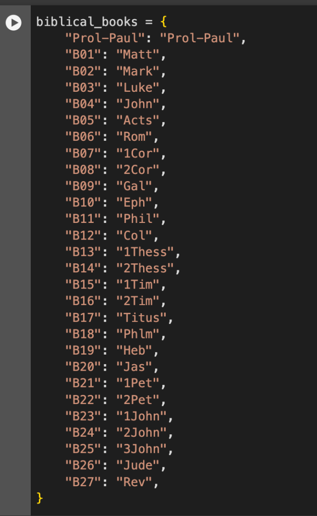 While I know that I only transcribed 2 Timothy and Titus in the example transcription for the last post, I want to write the code in a way that can determine what the biblical content is. I can see in the XML structure that every shift in biblical books, chapters, and verses is marked with a div tag that encodes the book, chapter, and verse numbers. The books are organized by the letter B and a number, starting at 1 for Matthew and ending at 27 for Revelation. I created a Python dictionary using the book encoding as keys and the corresponding biblical books as values.