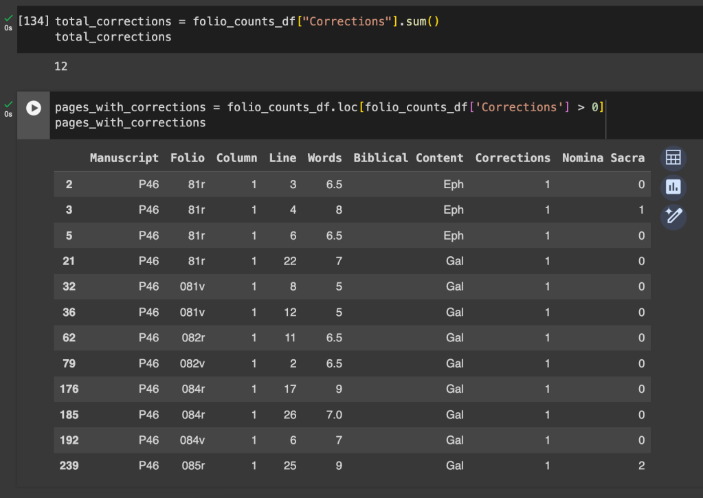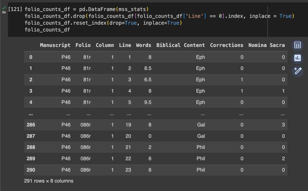 Now, I can convert my dictionary to a Pandas Dataframe. Because of the structure of the XML, I technically have a zero line, so I drop all rows that contain a line number equal to zero and reset the index. To keep things fresh for this post, I used the INTF’s published transcription of P46 for this code this time.