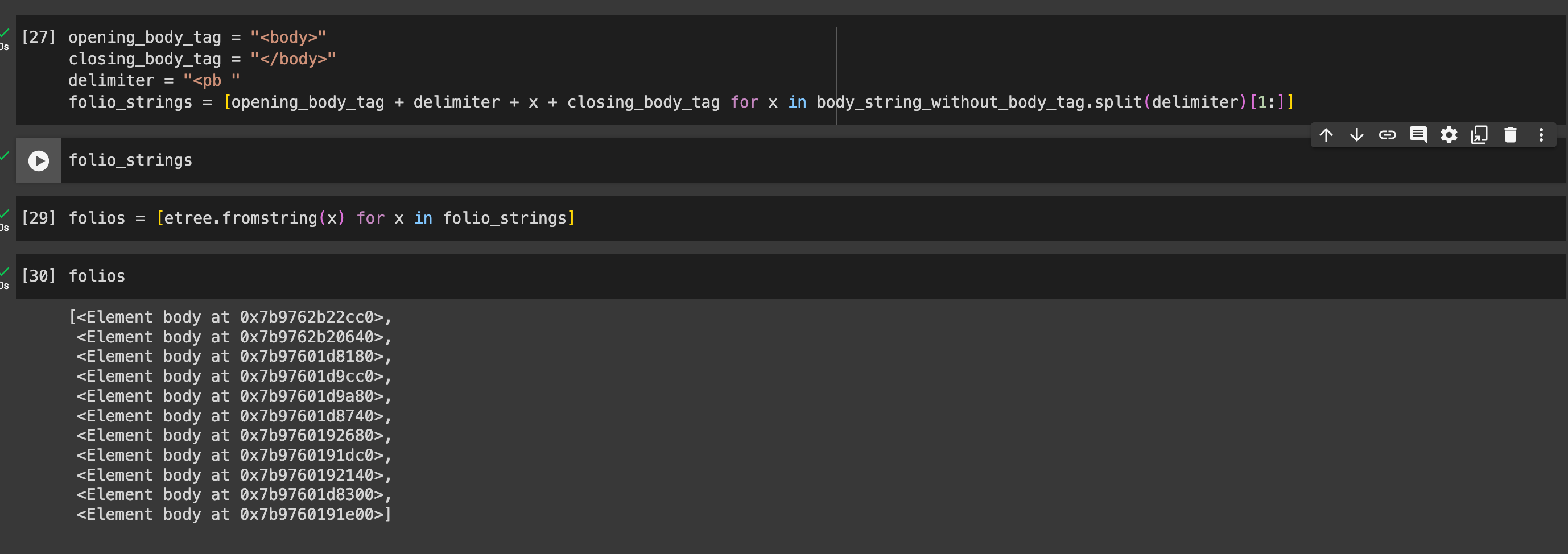 Next, I split this string at every pb tag, appended an opening and closing body tag to each split section, and added that section to a list using Python List Comprehension. Finally, I converted each of the strings containing its own XML structure for each pb tag into a list of etree objects saved to the variable folios.