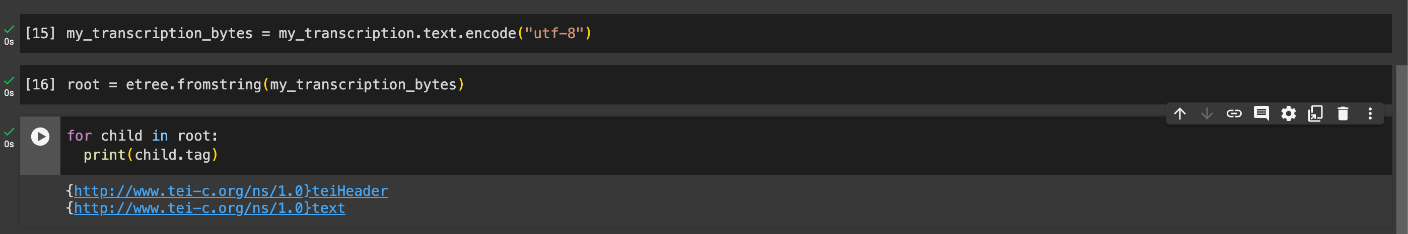 Google Colab helped me troubleshoot an issue when I tried to load my_transcription into an etree like LXML requires. Colab told me I needed to convert the string to bytes and load it. I followed Colab’s advice, and it worked like a charm. The variable root points to the very first tag of the XML transcription, the TEI tag. To demonstrate how the tags nested within the first tag, I looped through each tag element in the root and printed the tag. The output shows only two tags, the teiHeader, and the text tag. Now, more tags are further nested under these, but this demonstrates how you can iterate over and select tags.