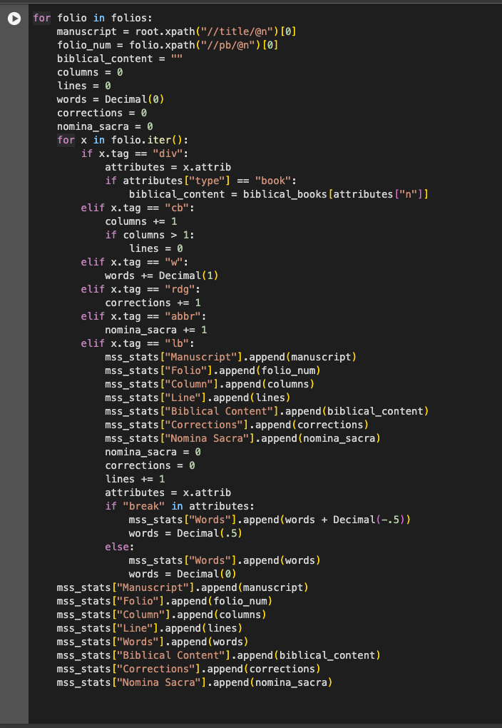 Now, I can loop over each of these etrees in my folios list and do some analysis. I noted in my last post that researchers record basic statistics for codicological data by examining a sample size of folios for the manuscript by hand. Because my XML transcription encodes the kind of data researchers look for, I can find this information for all the folios I have transcribed, which are now saved in my list of trees. I want to know the number of columns per page, lines per column, words per line, total number of words, total number of corrections, where those corrections are, etc.