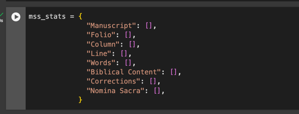 I want all the information on the folios saved into an Excel-like format displaying information in rows and columns. After tinkering with a few designs, I wanted one row of data corresponding to a single line. To achieve this, the next library from my list above can help. The Pandas library is a powerful Python library for structuring data into a Dataframe (rows and columns). To convert my data into a Dataframe, I need a dictionary where each key is the columns, and the values are lists that contain data for the rows. I initialized this dictionary to fill it with the data I wanted.