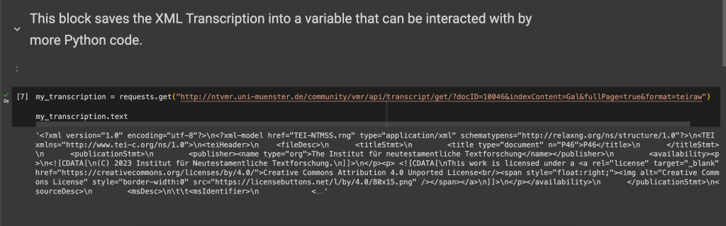 In the image above, you can see that I created a block with Markdown text explaining what I am doing. I saved the request in the variable my_transcription and then displayed the output of that variable with my_transcription.text. A single string contains the entire XML transcription at the moment. I could write this string into a file using Python to save the transcription on my computer. If I don’t care to save the transcription as a file, I can just interact with the transcription stored in this variable.