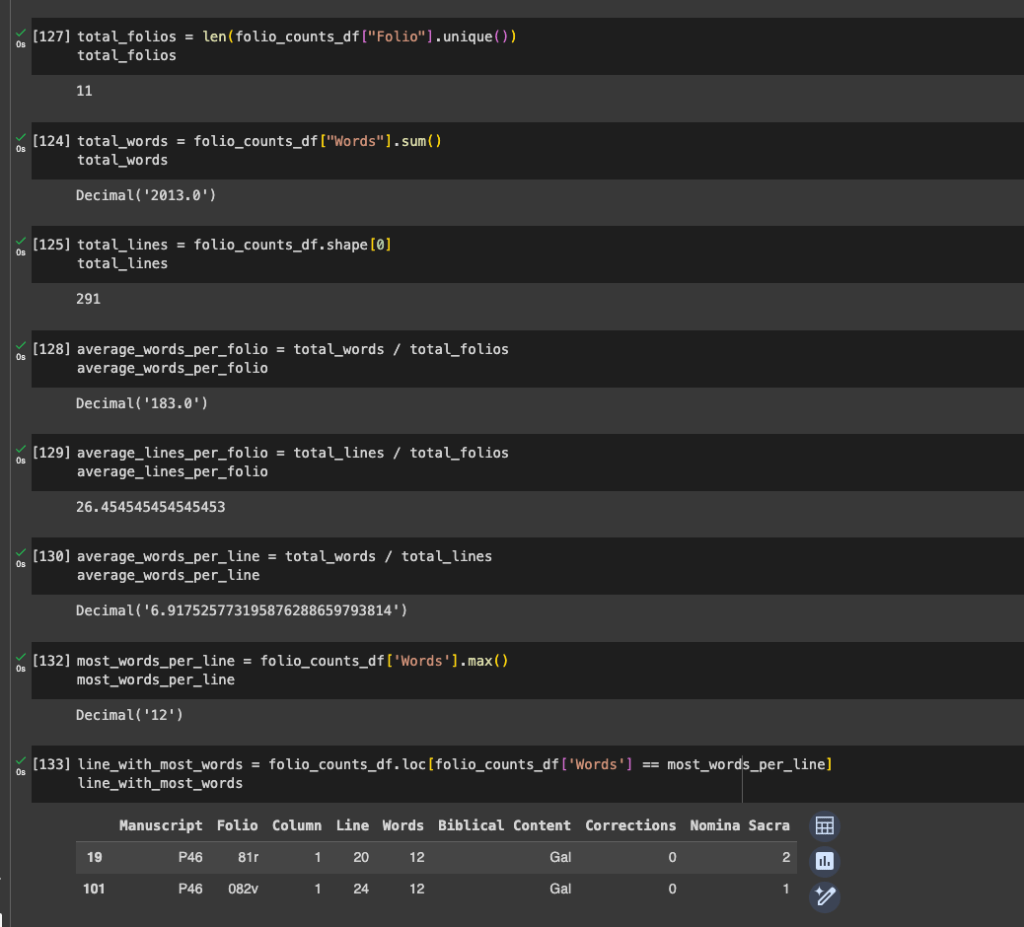 This is how I chose to tackle this problem and how I chose to organize my data. The beauty of Python is that you can easily customize what I have done here to suit your needs better or improve upon the approach I took here. I hope to have demonstrated some resources you can use to leverage Python to analyze TEI-XML transcriptions for information such as codicological statistics. If you have already done the hard work of transcribing a whole manuscript in TEI-XML, you should squeeze every ounce of information out of that transcription. Because XML is machine-readable, Python provides the means to read that XML and convert it to the data you need.