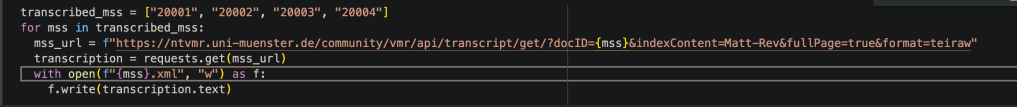 The Institute for Textual Scholarship and Electronic Edition and the University of Birmingham, UK (ITSEE) have developed a tool to collate digital transcriptions. This tool is called the standalone collation editor and can be found on ITSEE’s GitHub. The collation editor can be downloaded onto your local machine and uses locally stored files to collate. Therefore, the first thing you’ll need is your transcriptions! In my last post, I demonstrated how to use Python to get a hold of your transcription using the Requests library. A list of transcriptions could be programmatically downloaded.
