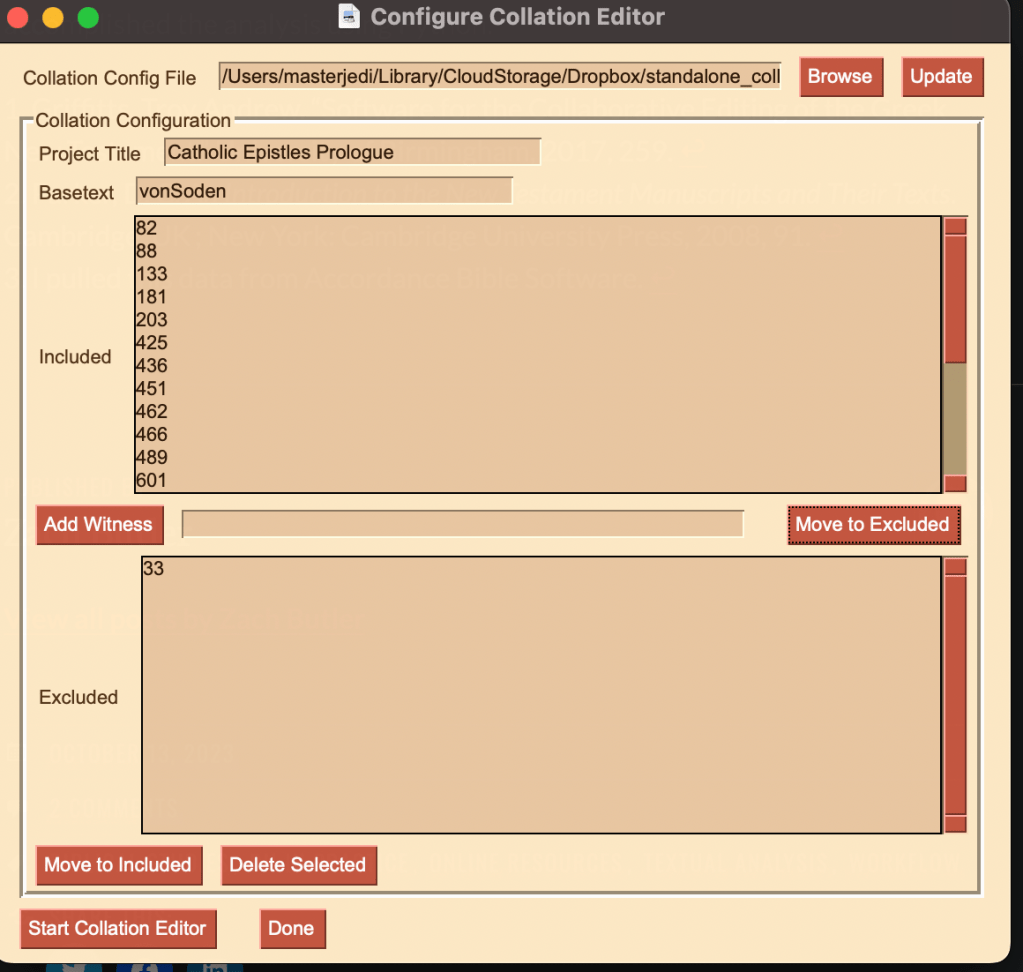 If you click Start Collation Editor before clicking the Update button, the old unmodified config.json file will be used instead. On that note, clicking the Start Collation Editor will start the editor, so you do not have to open it from the terminal. The collation editor deserves a post of its own, however, so I will not go any further than this.