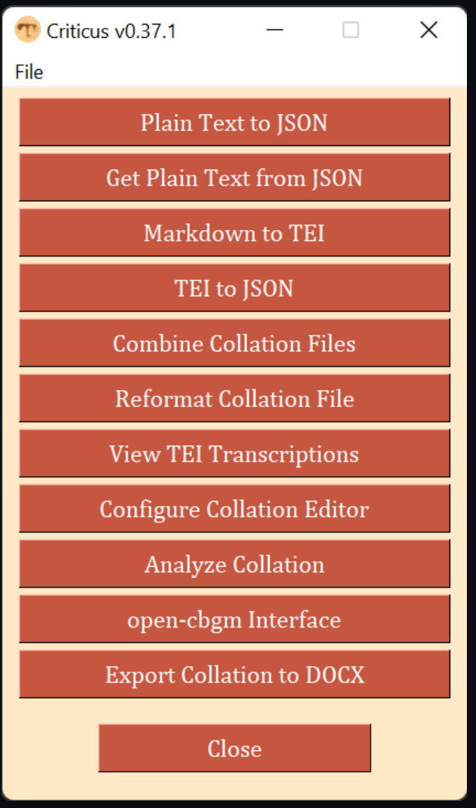 Criticus is a desktop app created by David Flood that can be found on David’s GitHub here. Criticus contains ten different tools for working with XML transcriptions to help solve some of the common data conversions needed to utilize the whole toolchain for transcription analysis. Criticus can be downloaded and run locally, or if you already have Python installed, Criticus can be easily installed with pip!