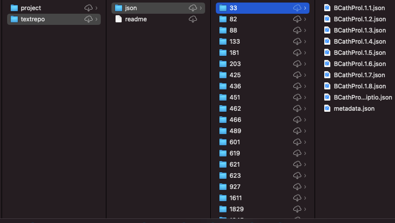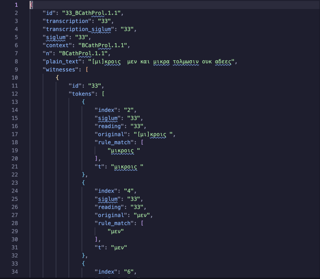 Each verse is saved into its own JSON file, and the name of the file follows the format specified above. However, notice that my book symbol, “B,” does not contain a number. I named the “book” CathProl but still utilized chapter and verse numbers. As an example, the first “verse” of the Catholic Prologues in MSS 33 looks like this: