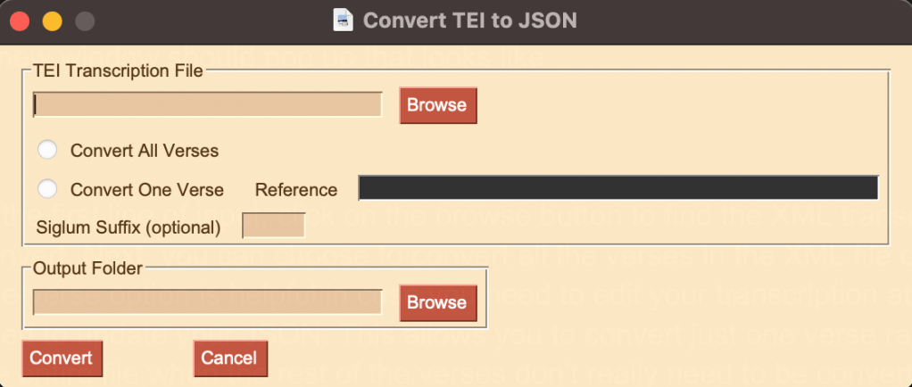 In the first line of input, click on the browse button to find the XML transcription that you want to convert. Next, you can choose to convert all the verses in the XML file or just one verse. The one-verse option is helpful in case you need to edit your transcription at a particular verse and need to update your JSON. This allows you to convert just one verse rather than reconverting the entire file when the rest of the verses don’t really need to be converted again. However, Criticus follows the verse reference format specified by the IGNTP and INTF. For example, B06K13V1 is the verse reference for Romans 13:1 (B06 = Romans, K13 = chapter 13, V1 = verse 1). This is important, especially if you are transcribing anything that is not biblical text and possibly does not follow this format. For instance, I transcribed the Euthalian Apparatus Prologues to the Catholic Epistles, and they do not have a book, chapter, or verse system. I created one for the Euthalian Apparatus, that maps to this format so that it would work with Criticus, and you may need to also. If you are collating biblical text, however, there is no need to worry.