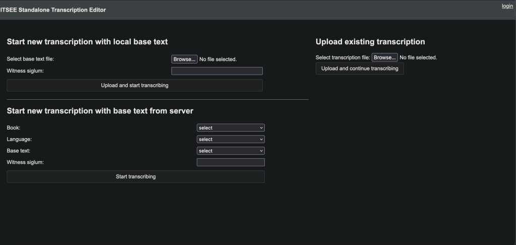 Alternatively, I also discovered another tool developed by ITSEE that can be used for transcriptions. They have a standalone transcription editor that can be found here. This editor works just like the one found on the NTVMR, but transcriptions are saved locally from the outset. You are also able to bring your own base text, in case you are transcribing something other than biblical text. The standalone transcription editor does not have any images of the manuscripts available. It just contains a transcription editor, so you will still need to view images on the NTVMR, Center for the Study of New Testament Manuscripts (CSNTM), or elsewhere.