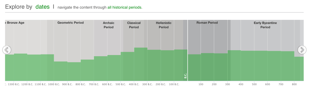 All these options cater to a variety of research needs, yet it is through the “dates” and “map” options that the platform truly shines. By initiating their search through the “dates” option, a user is able to explore items related to various eras of the region, beginning from the Middle Bronze Age and ending with Modern Greece. This search option may be of particular interest to scholars who wish to delve deeper into a specific period of interest and acquire an overview of all items related to that particular era, without having to go through each collection manually. In addition, the “dates” search option also highlights the historical depth and regional cultural connections that evolved and flourished throughout the centuries in the area, such as those related to the Roman or the Ottoman period. In that way, a user is able to acquire a comprehensive temporal overview of the digitized cultural objects related to the various communities and cultures that existed in the longue durée on the southern tip of the Balkan peninsula and then narrow down their search by “year span”, “language”, and “type” of object, among other options.