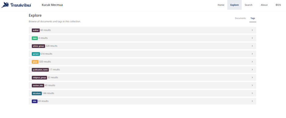 Finally, the Digital Editions under the Digital Ottoman Corpora infrastructure publishes facsimiles of Ottoman Turkish texts and transcriptions on an open-access platform. The first work within this project is the digital publication of Ziya Gökalp’s Küçük Mecmua, a weekly journal published between 1922 and 1923. Küçük Mecmua provides the thematic framework that was established in the Digital Ottoman Corpora’s crowdsourcing project. It employs a ‘Turkified’ Ottoman Turkish orthography and vocabulary together with Turkish nationalist and folkloric themes. The digital version of Küçük Mecmua is now available on Transkribus, accompanied by an interactive index that allows users to easily navigate and search through the text. Users can also navigate by tags which can be useful to those looking for names, places, and dates, and it is fully searchable.