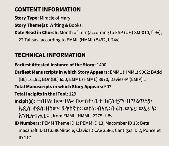 Given the wealth of information, I take only one example of navigation: that by the text, or “story” level, which is probably the most innovative in this project (although searching by image is also very useful and, in the context of Ethiopian studies, very innovative). Each text is given a unique identifier by the project associated with the identifiers of the Beta Maṣaheft (BM) project, which has established a clavis of Ethiopian texts. Similarly, when a miracle has a French or European origin, it is linked to the clavis established in 1902 by Poncelet, which served as the basis for a database of Latin Marian miracles created in 2005 at Oxford. It is to some extent the model for PEMM, but one technological generation earlier, and therefore with different technological and scientific choices. For instance, it is not possible to run a query by ID to look for all the miracles with a Poncelet ID.