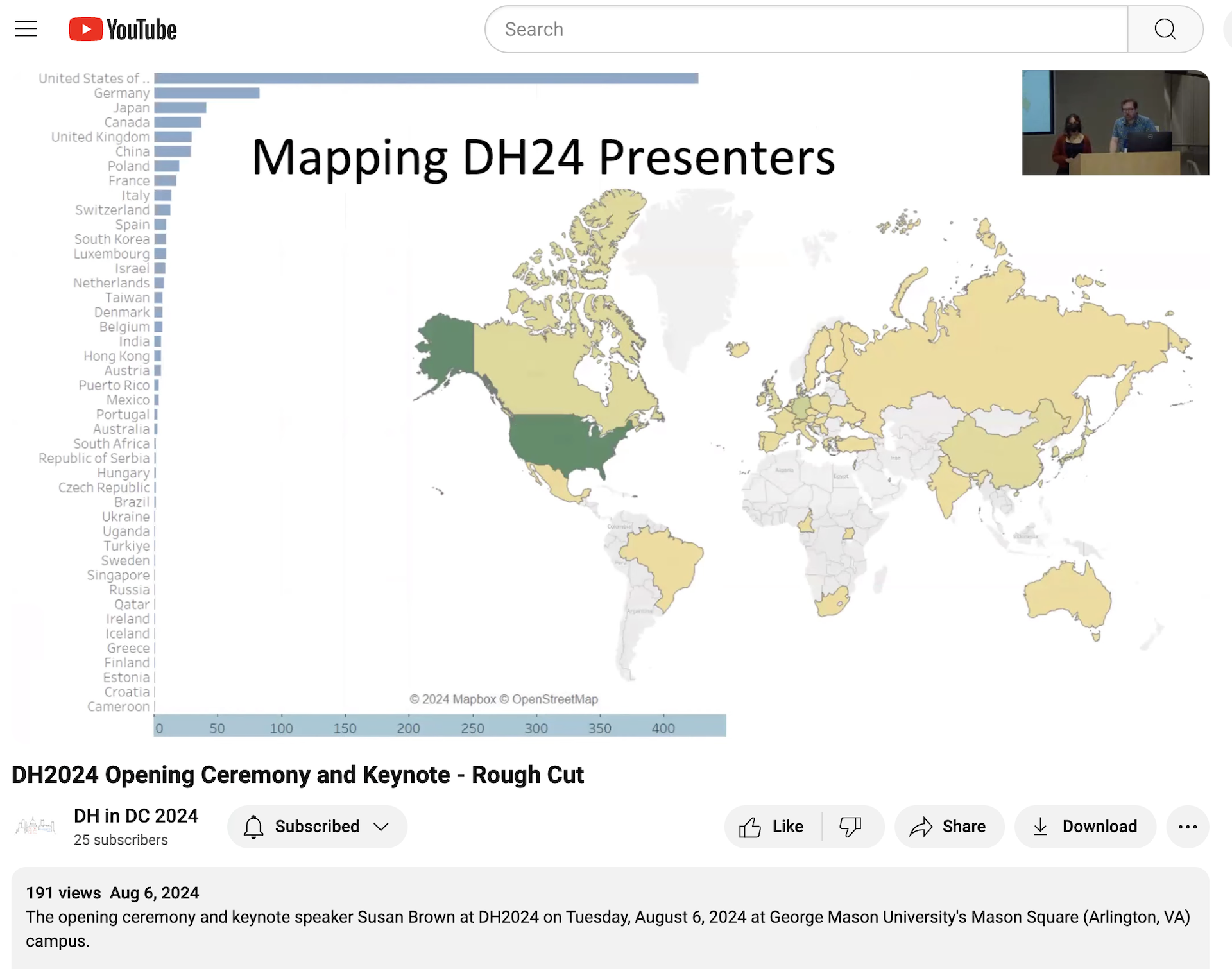 The organization’s annual international conference’s web presence is still young, but you can access DH2023’s robust online resources at its YouTube Channel, @dh_Graz137 (ADHO Digital Humanities 2023, with the conference’s Closing and Opening Ceremonies, Keynotes, Lunchtime Lectures, and curated playlists), and DH2024 Keynote presentations are available at @DHinDC2024.