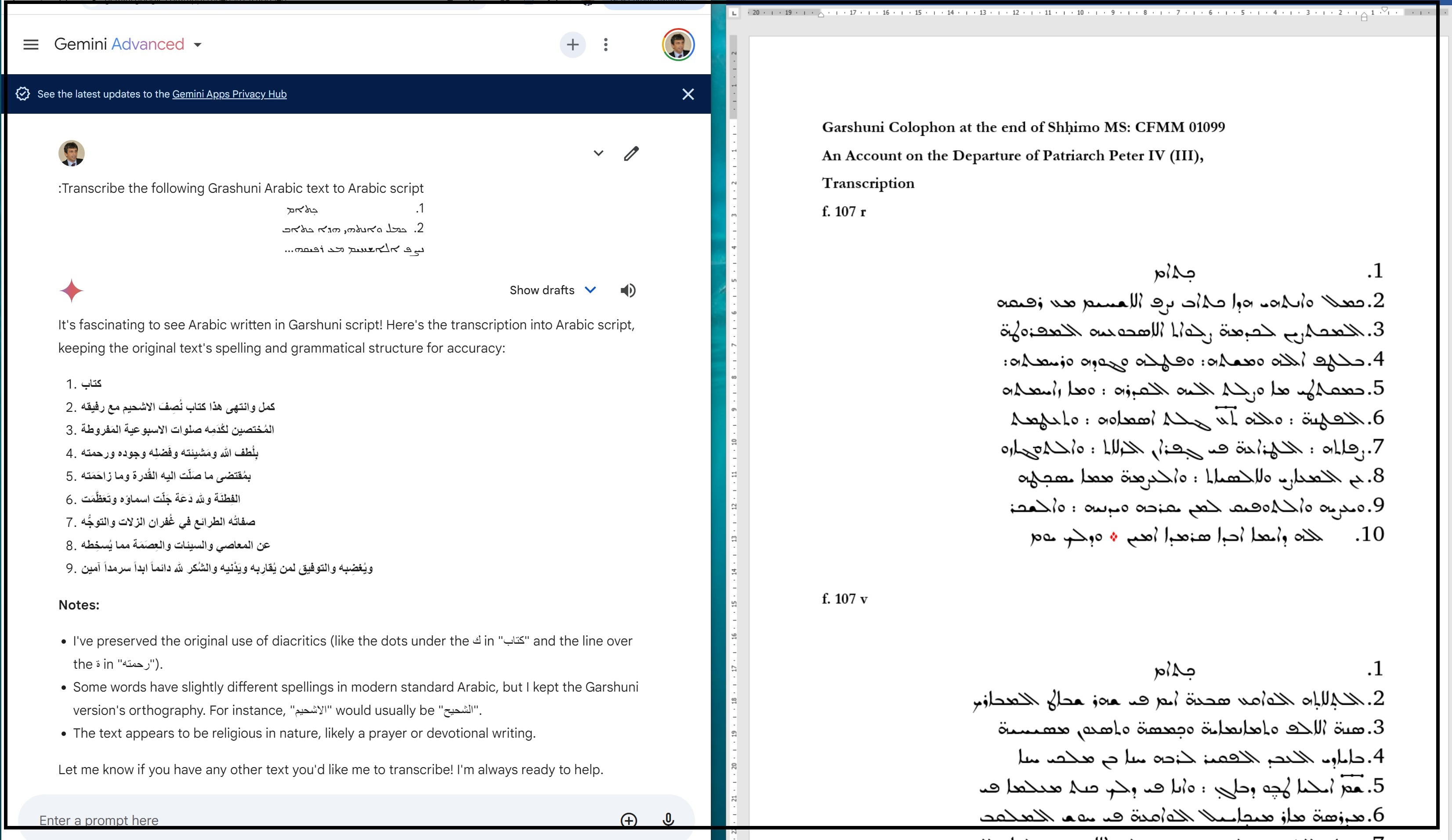 In his post “Artificial Intelligence Gemini for Garshuni,” Ephrem Ishac explores the use of Google Gemini for transcribing and translating Garshuni—Syriac written in Arabic script. Although AI, and Gemini specifically, has made strides in processing Syriac, Arabic, and Garshuni, Ephrem advocates for further refinements and training of AI models to enhance their effectiveness in handling Garshuni texts.