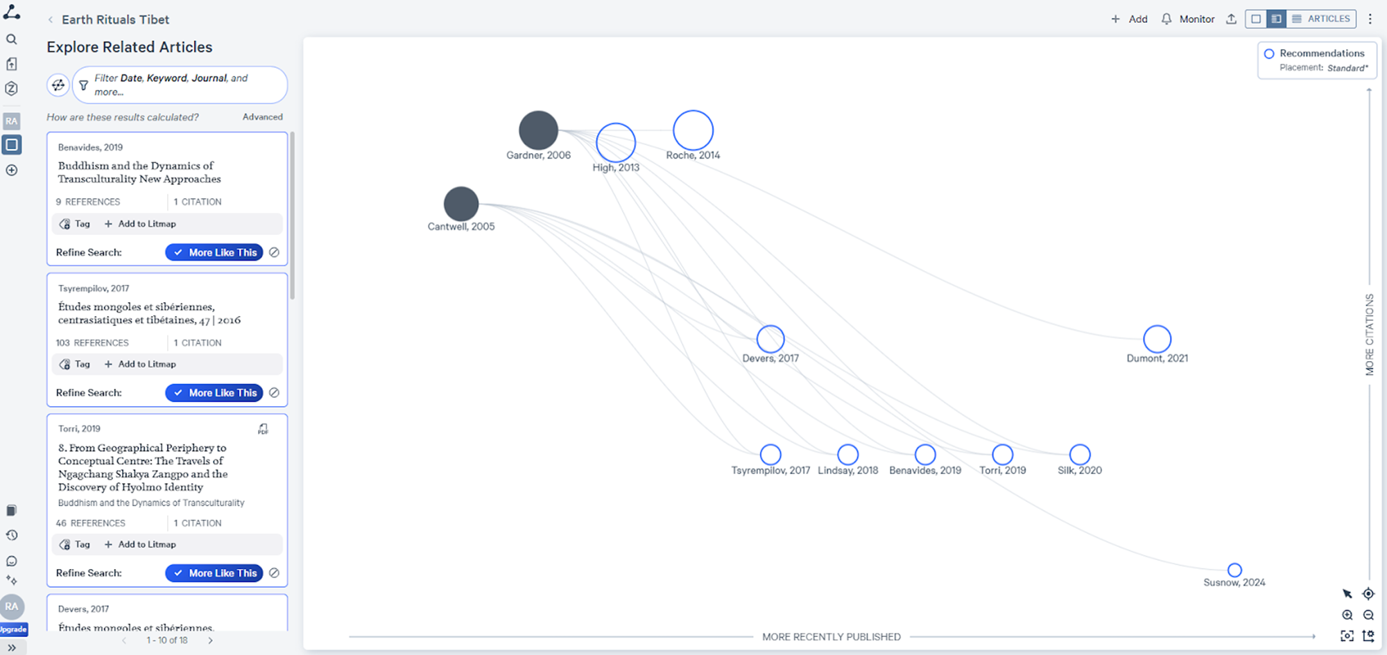 As with Connected Papers, selecting a node displays information about the publication, including its abstract, citation count, number of references, and DOI. You can expand the graph by using the ‘Add to Litmap’ option, which then generates additional nodes and connections based on your selection. Litmaps promotes iterative searching, so as you add more works to the graph, you can run the explore again to find new connections.