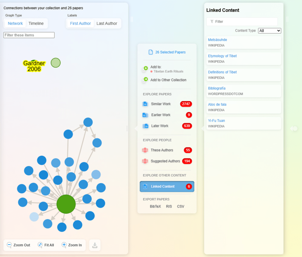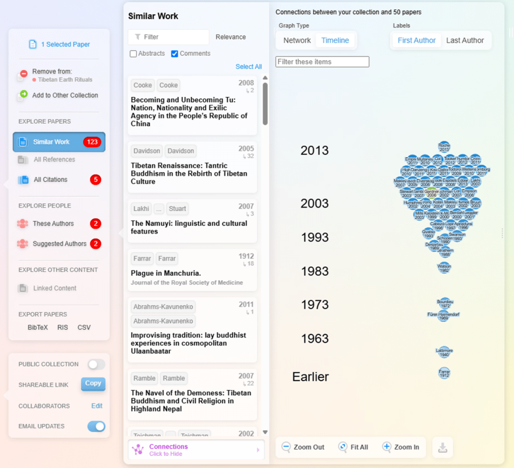 One of Research Rabbit’s standout features is its timeline view, which shows connections between papers chronologically. This is handy for visualising how research has evolved over time. Like Connected Papers, it also allows you to explore earlier and later works related to your selected publications, creating an increasingly detailed graph of connections. This makes it particularly valuable for exhaustive literature searches where breadth is important.