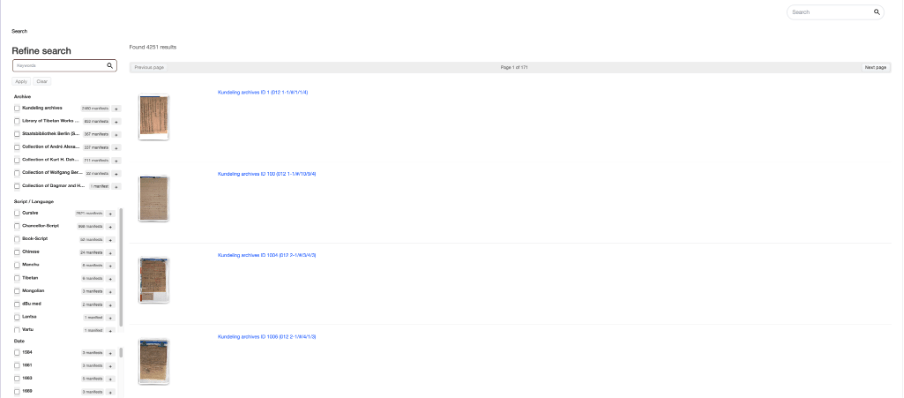 The original Digital Tibetan Archives were not just a collection of documents but a treasure trove of paleographic knowledge. Researchers had carefully documented the distinctive hands of individual scribes, the fluid variations in Tibetan writing styles, and the fascinating world of historical seals. While CrossAsia’s new home for the collection retains these insights through convenient filters for scripts, languages and seal characteristics (generated from the underlying metadata), some of the more detailed paleographic analyses (which were not recovered) had to be streamlined. What may seem like a compromise is in fact an important success story—where an institution like CrossAsia has stepped in to provide a sustainable, long-term home for valuable research material that might otherwise have been lost altogether.The transfer itself posed significant challenges for the two CrossAsia members Martina Siebert and Antje Ziemer. Initially lacking proper documentation of its structure and key relational elements, the database required considerable effort to make it operational in its new home. They found a permanent solution for it—and other digital collections of interest to CrossAsia users that are not part of the Staatsbibliothek’s collection—in the MADOC platform, an open-source application designed for the curation of IIIF-based digital objects. This system allows for hierarchical organization of materials, enabling researchers to navigate the collection through multiple pathways—by document type, date range, or geographic origin.