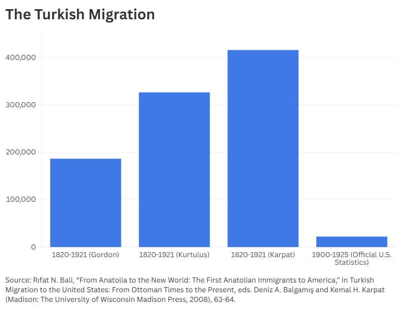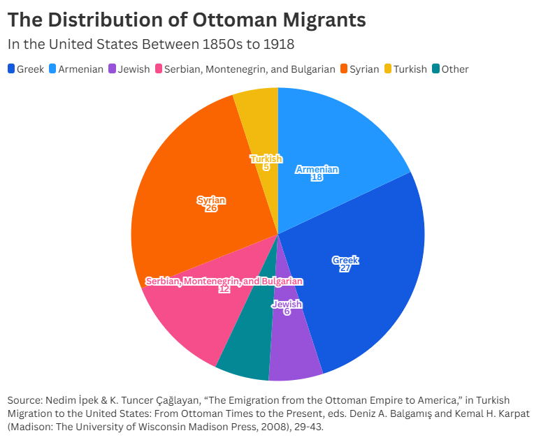 One of the main challenges in studying Ottoman migration to the United States is the inconsistency in migrant numbers, due to the lack of accurate registration records, making this an exciting yet complex topic to research. Although the exact number of people who migrated from the Ottoman territories to the United States remains unknown, I have tried to illustrate the presence of Ottoman communities, including Syrians, Greeks, Jews, Armenians, and Turks in the United States in the nineteenth and early twentieth centuries, based on figures provided by historians whose research focuses on Ottoman migration to the New World.