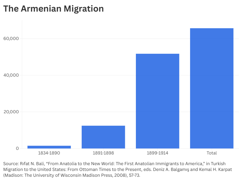 This article examines the flow of Ottoman citizens, including Armenians, Jews, Christians, and Muslims, to the United States during the nineteenth and early twentieth centuries. Migration from the Ottoman Empire to the United States has not been explored as extensively as migrations from Europe or the Far East, nor is it widely studied by Ottoman or Turkish historians. Using Flourish to visualize the number of Ottoman migrants who crossed the Atlantic and settled in the New World, I aim to shed light on the Ottoman migration experience to the United States and to situate migration from the Mediterranean region within the broader context of nineteenth-century global migration, which is a new trend in Ottoman migration historiography.