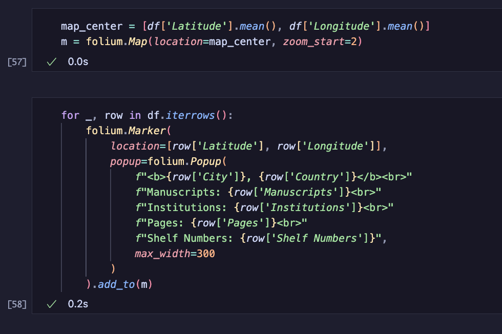 All that’s left is to create the map and pass these coordinates into it to create points to be marked. Folium also allows you to add additional text or data to the point that is displayed when a user hovers over the point with the mouse. The data about the number of manuscripts and pages could be used for this.