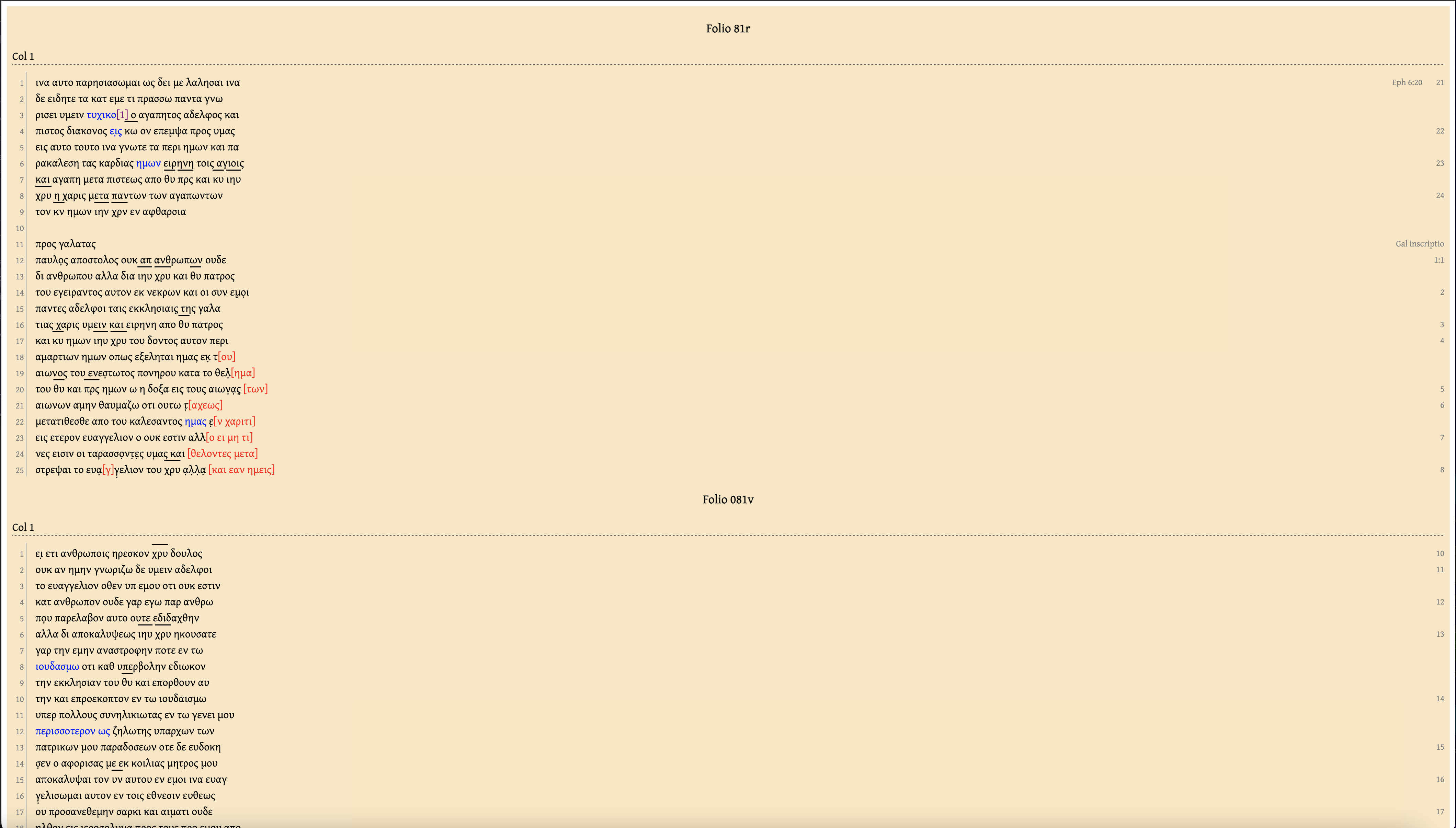 David Flood, the creator of Criticus, an app I wrote about in a previous post, has utilized this data to clone some of the functionality of the NTVMR. The NTVMR allows users to look up manuscript information in the Liste and to view images of manuscripts. The NTVMR has much more functionality than this, though, and simple tasks like looking up a manuscript can be slow while the web app loads all of the pieces of the application. David leveraged the API to create a web app at https://undergroundliste.com/, allowing users to look up manuscript info and view images. His app is faster than the NTVMR because it only does one thing and is very lightweight.