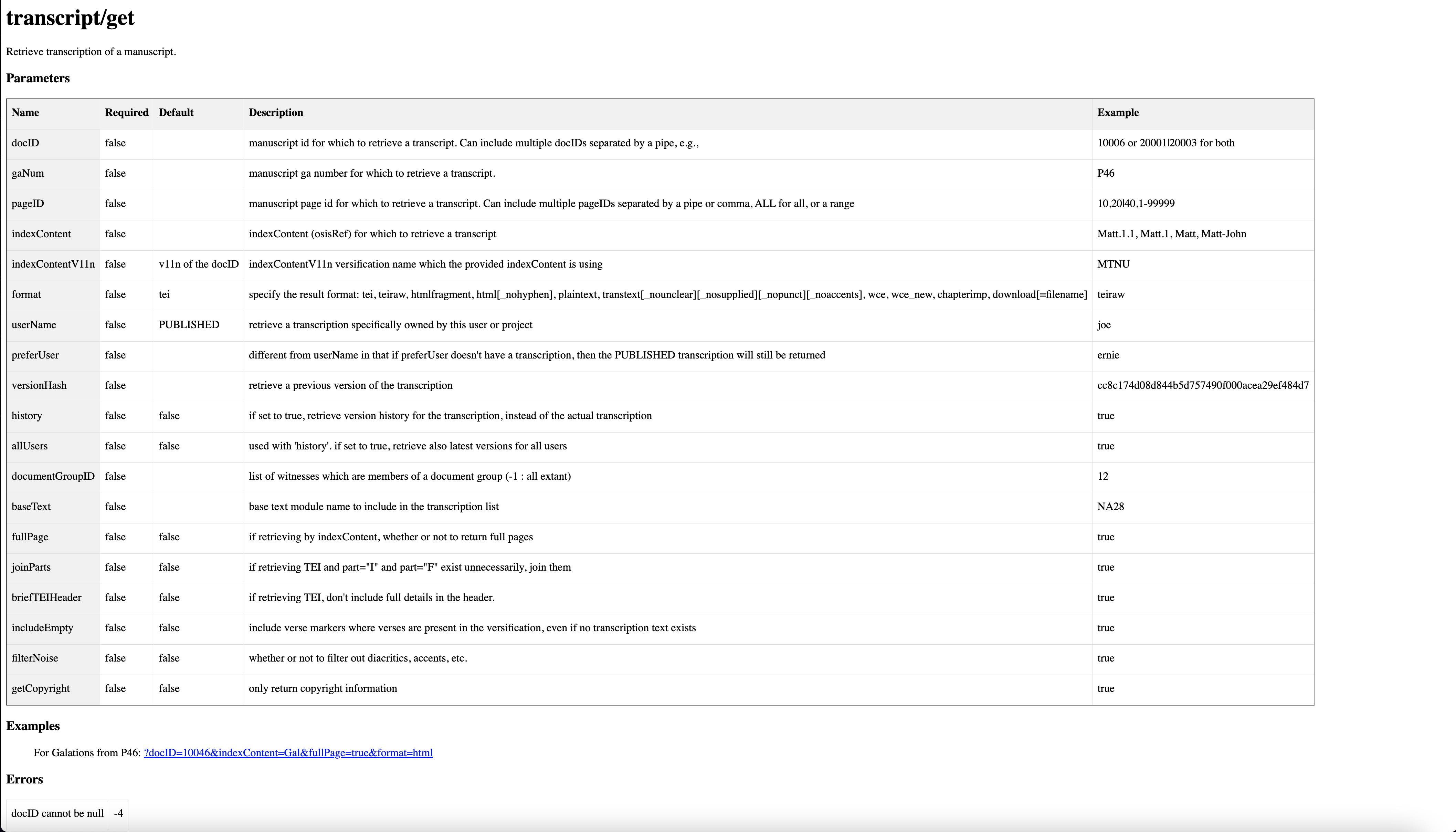 Clicking on “transcript/” and then “get/” will lead you to a webpage that contains a table with key and value pairs that can be added to the URL. There is a short description of what each key does and the kinds of values that can be passed into it. There is also an example at the bottom of the page of what you could add to the base URL of the page.