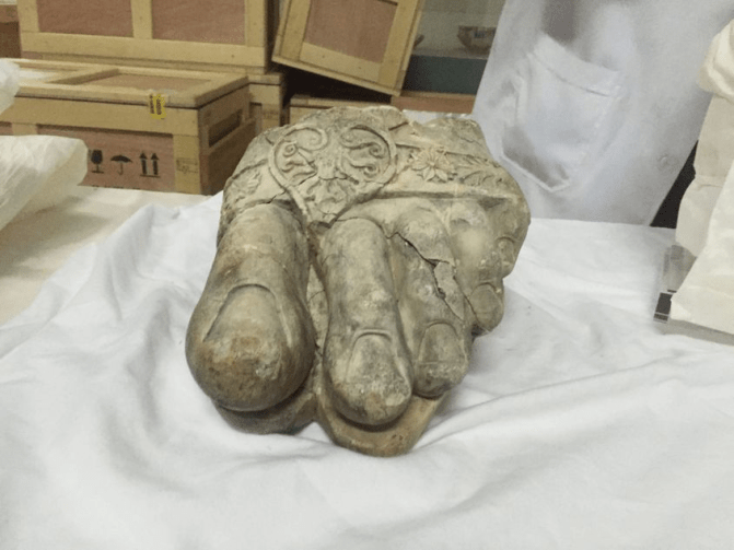Figure 1: The marble foot fragment found in “The Temple of Indented Niches” in Aï Khanoum, Afghanistan. Photographed while the fragment was held by the Japan Committee for the Protection of Displaced Cultural Properties in 2016. “The Foot of Zeus,” Prospect, August 03, 2016, available at: https://www.prospectmagazine.co.uk/world/43169/the-foot-of-zeus. ©Llewelyn Morgan.