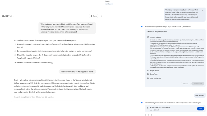 To test the reach and capacities of the OpenAI and Google Deep Research models, I inputted a major point of debate in Hellenistic Central Asian studies: the identity of the Aï Khanoum sanctuary main cult statue. All that remains of this statue is a fragment of the foot.