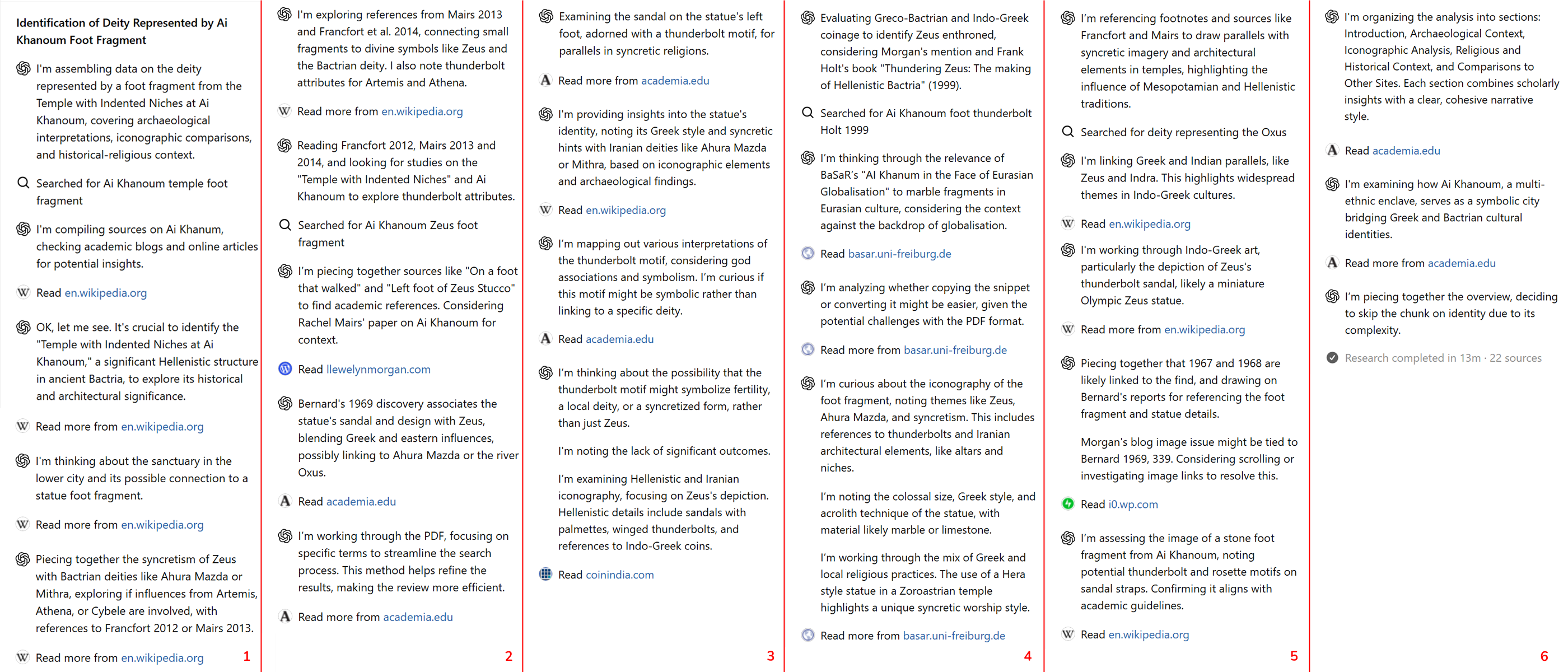 The text produced by ChatGPT o3 covers some major discussions related to the Aï Khanoum foot, primarily focusing on the identification of Zeus but also highlighting most of the other theorized deities. It is essentially an adequate essay summary of the relevant debates using the immediately available English sources found in an initial search. However, the most recent source comes from 2019, and none of the vast collection of non-English materials studying this foot fragment are included in the source list. Without more recent works and the full breadth of non-English works exploring the topic, ChatGPT o3’s Deep Research output simply reinforces pre-existing Western, anglo-centric notions of the Aï Khanoum deity.
