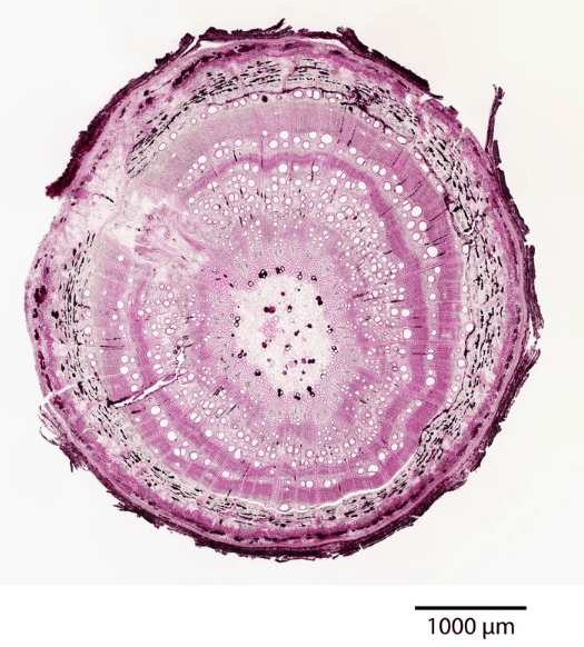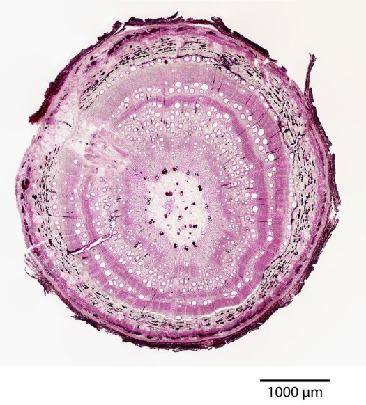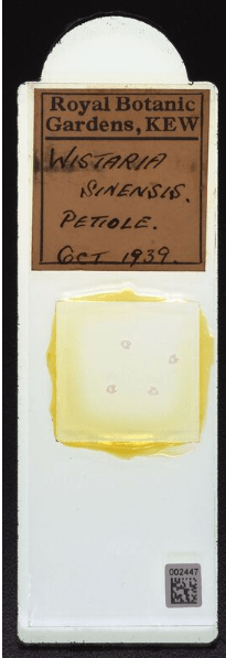 The digitisation team at Kew very kindly digitised several microscope slides of wisteria specimens to use in this article some of which you can see below (see images 6, 7 8 and 9). The microscope slides have a more complex imaging process completed by a specialist digitisation officer. It involves taking an image of the complete slide and then other high-quality magnified images of the specimen are captured against a backdrop of brightfield illumination with a ZEISS Axio Scan.Z1 microscope. Minor corrections are then applied to these images, and a scale bar is added for scientific representation. In comparison to the images so far included in my article, these images are yet another perspective, which show new dimensions of the plant only made possible through microscopic imaging techniques. This is perhaps previously the least accessible perspective of botanic study for both researchers and the public. In combination with the other forms of herbarium specimens in the collection, allows users to both focus in on, and widen, their examination of Kew’s specimens. The textures and colours are beautiful and diverse, contrasting to the dried mounted specimen. I can even anticipate that beyond their scientific and historic value, these images could be used as inspiration in art and design – connecting the sciences and arts through digitisation.