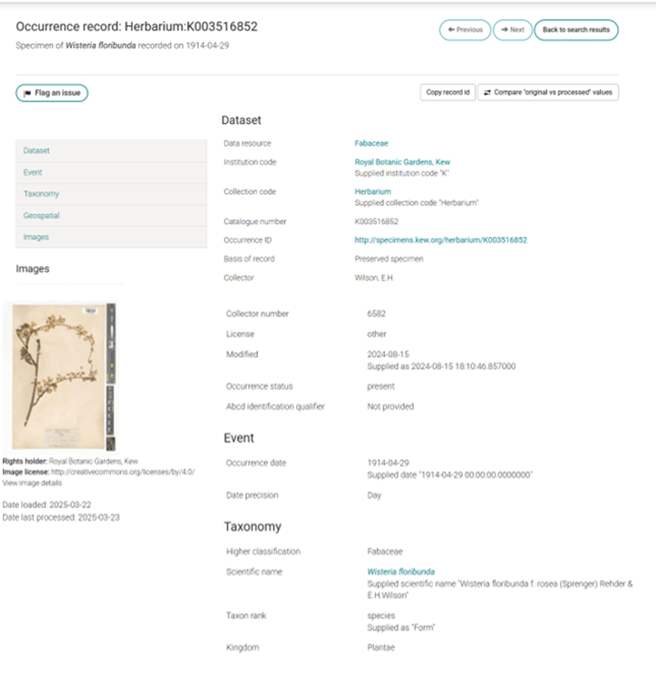The digitisation process involves imaging herbarium specimens with mostly Fujifilm GFX 100S or Phase One iXH cameras depending on the type and needs of the herbarium sheet. The image also displays components including a ruler and colour chart to the right of the herbarium sheet, a standard practice in digitisation to quality assure colour, resolution and focus. Digitisation officers use Capture One software when imaging, and Kew has also created a custom style through this software which is applied to each image. You can see more of this in action when the project was covered by BBC news last year. An important aspect of the digitisation project is that each sheet with specimen material (including illustrations, photographs and cibachromes) must be barcoded with a catalogue number and a record created on the ICMS database with storage, occurrence and collection event information transcribed. On the data portal, users can search directly for the corresponding record and image if available (records are continually being added as the project progresses), appearing as so: