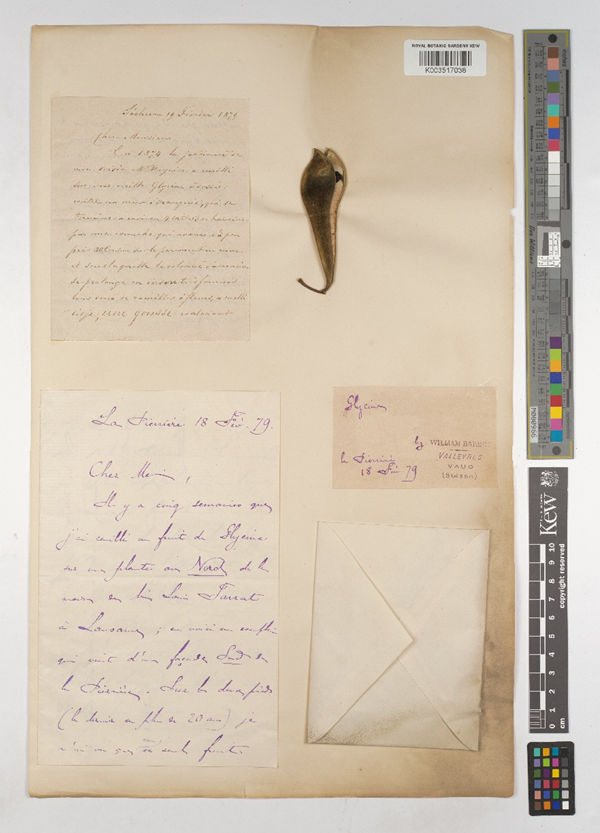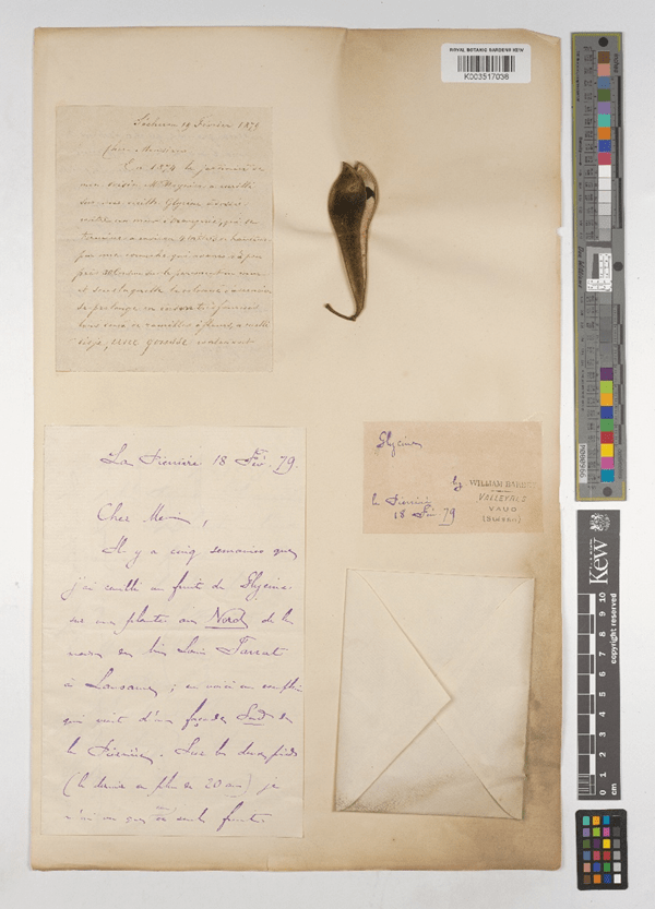 The second specimen shows a different species, Wisteria sinensis, but also shows a different aspect of the plant (see image 3). Wisteria are in the legume family, and as well as the blue-purple flowers, produces toxic seed pods/fruit. On this sheet, the collector, William Barbey, a Swiss botanist, details in a letter that he has collected fruit from a Glycine plant, a synonym of Wisteria, five weeks ago. Whilst not showing the same parts of the plant and therefore we can’t compare the characteristics of the flower to the first specimen, here we gain a new perspective on plant by Barbey’s collection of the seed pods. The label written by Barbey unfortunately is unclear on the collection locality, attributed in Kew’s collection to the East Asian region. However, by digitising the sheet and making it available for the public, students and researchers, these new deductions and analyses could be made, and this is ultimately one of the most significant benefits of digitising.