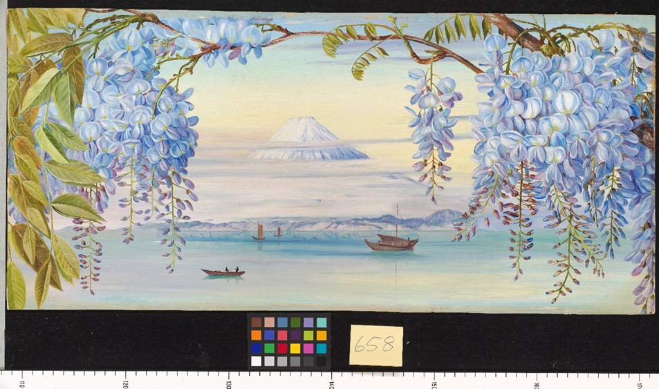Botanical illustrations hold an important role in Kew’s collection and provide useful illustrations of a plant’s visual characteristics which may not be possible to capture through photography alone. Historical illustrations also provide further context to the work of botanists and plant collectors of the past, sometimes even being attributed as an original depiction of a specimen in lieu of the physical specimen. In the case of biologist and botanical illustrator, Marianne North, her travels around the world exposed her to many species, some of which were new to science and have been named in her honour, such as Crinum northiana and Nepenthes northiana. North travelled to Japan for a short time in the mid-1870s, depicting the landscape and everyday life. She had hoped to stay for a number of months, but developed rheumatism and moved on to Singapore to recover. While she was in Japan, she wrote to Kew’s founder, Joseph Dalton Hooker, about Japanese bonsai and bamboo, and painted several landscapes. Below (see image 4) is her painting of Wisteria chinensis from this time, and her artistic interpretation gives a different perspective to the herbarium sheets above. Her illustration shows the key characteristics of the plant and colours of its flowers, but additionally alludes to a fascinating observation. Here, the wisteria flowers or fuji in Japanese, are framing Mount Fuji, an iconic symbol of Japan, and often linked to wisteria as they share the same name.