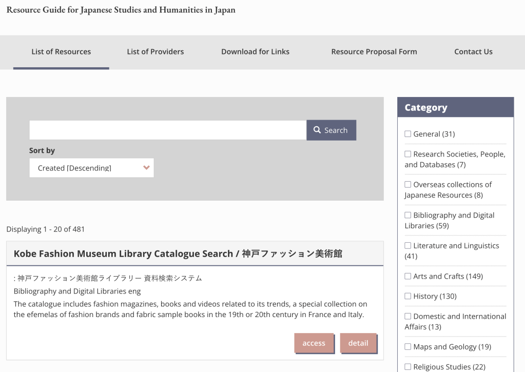 The first thing that a use of the Resource Guide might notice is that its introduction is a little confusing. Its description says that it is “a collection of links to useful English websites and resources pertaining to Japanese studies and humanities in Japan,” but for the most part it is actually a list of links to Japanese websites. The Resource Guide itself is mostly in English with English menu titles, and a lot of the entries containing English descriptions and sometimes translated English titles as well, yet some entries also usually contain Japanese titles and sometimes Japanese descriptions as well. The original aims of the project when was started in 2013-2014 was that of having a “English Resource Guide for Japanese Studies and Humanities in Japan,” as a means to promote the globalization of Japanese studies and make these resources available to other audiences. Right now, there is no option to change the language into Japanese, which might expand the audience to other non-English speaking audiences. Whether such an update can be expected is unclear. The copyright mark at the bottom of the page lists 2019, which might indicate that the Guide is no longer actively updated.