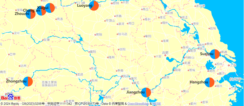 As shown in the maps, Yuan Zhen’s sentiment expression was generally more negative. Except for Yuezhou 越州, negative sentiments predominated in all recorded locations. In contrast, Bai Juyi’s sentiment distribution was more balanced. Positive sentiments clearly exceeded negative ones only in Luoyang 洛陽, while in other locations, they were roughly comparable.