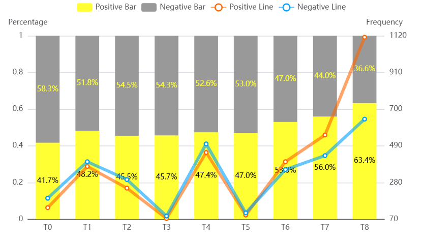Figures 4 and 5 illustrate the temporal variation of sentiments. Bars represent the proportions of positive and negative sentiments in each period, while lines indicate their respective frequencies. The results closely correspond with the location-based analysis.